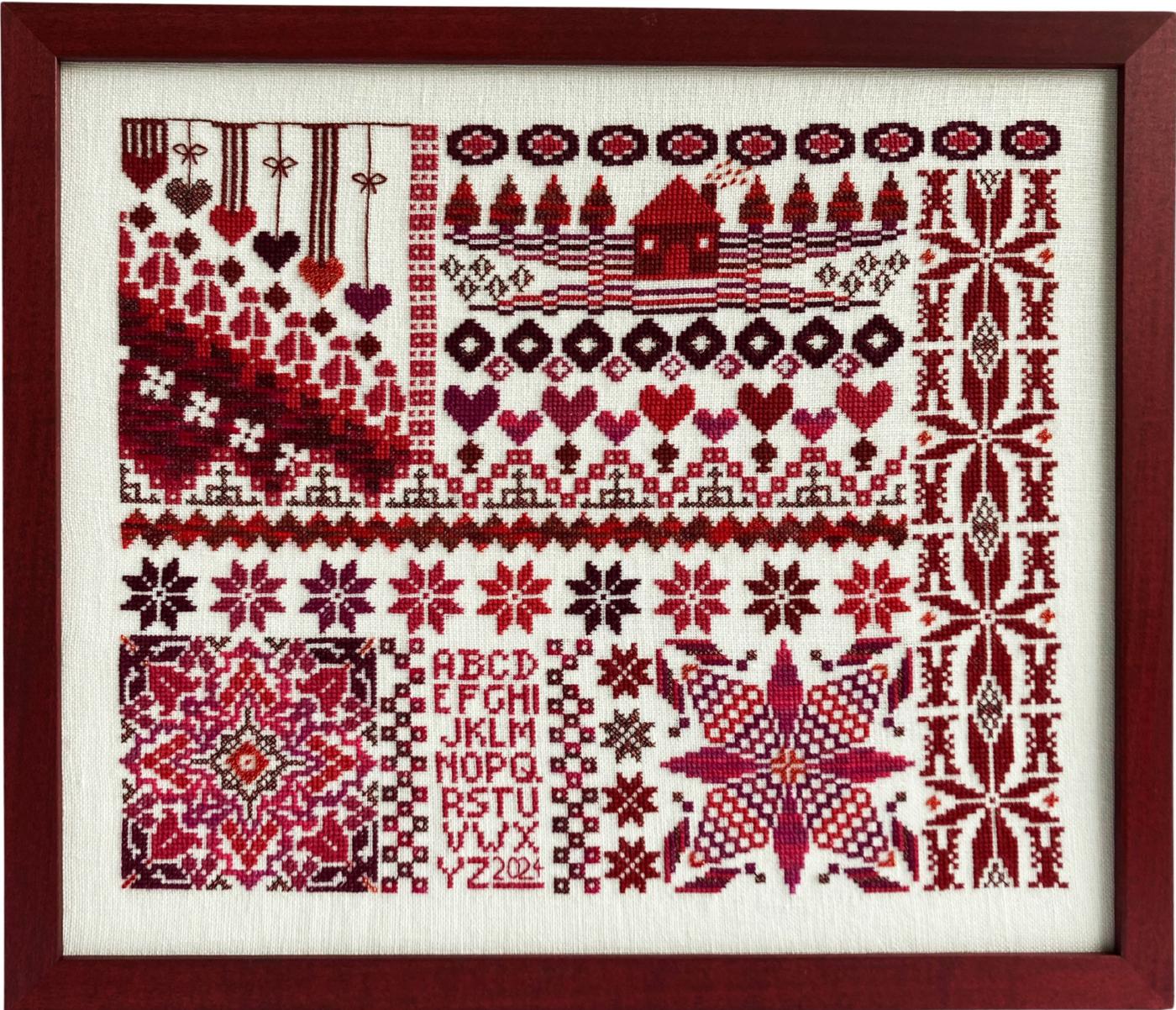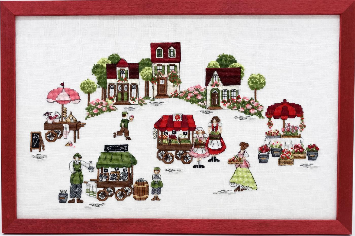 Abb. 19: Darstellung einer nostalgischen Marktszene, Beispiel einer Stickerei im Kreuzstich mit Konturenrändern, 2023 (eigene Stickerei, eigenes Foto)