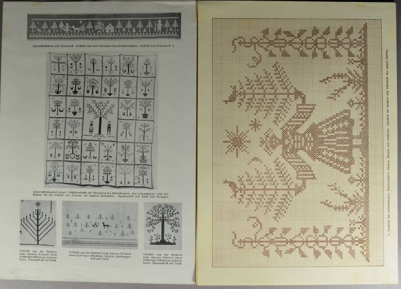Abb. 2: Doppelseite mit Stickmustern aus: Gestickte Sinnbilder. Eine Sammlung deutscher Sinnbilder für Kreuzstichstickerei bearbeitet von Christel Wöhrlin, hrsg. Von Hans-Friedrich München 1937 – 1938.- https://skd-online-collection.skd.museum/Details/Index/6183477#