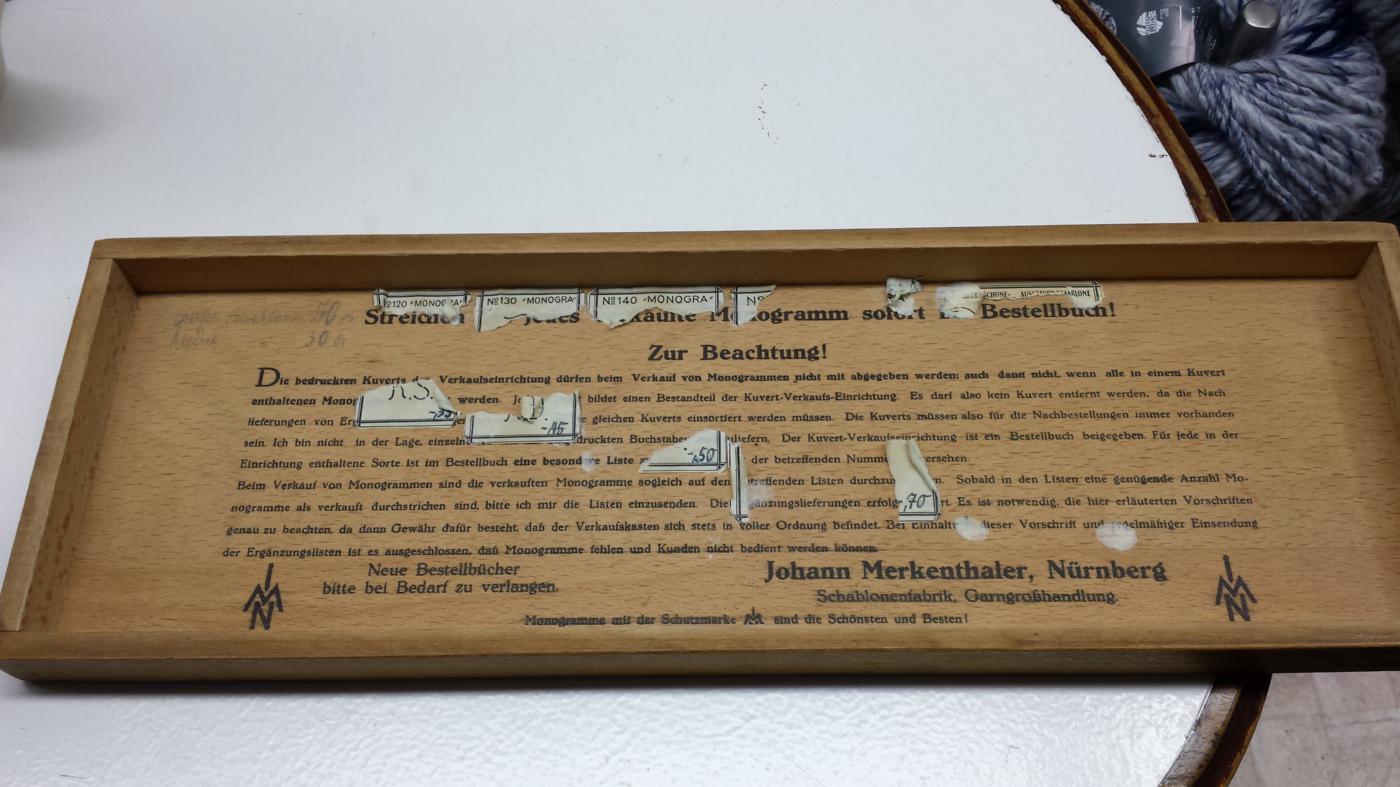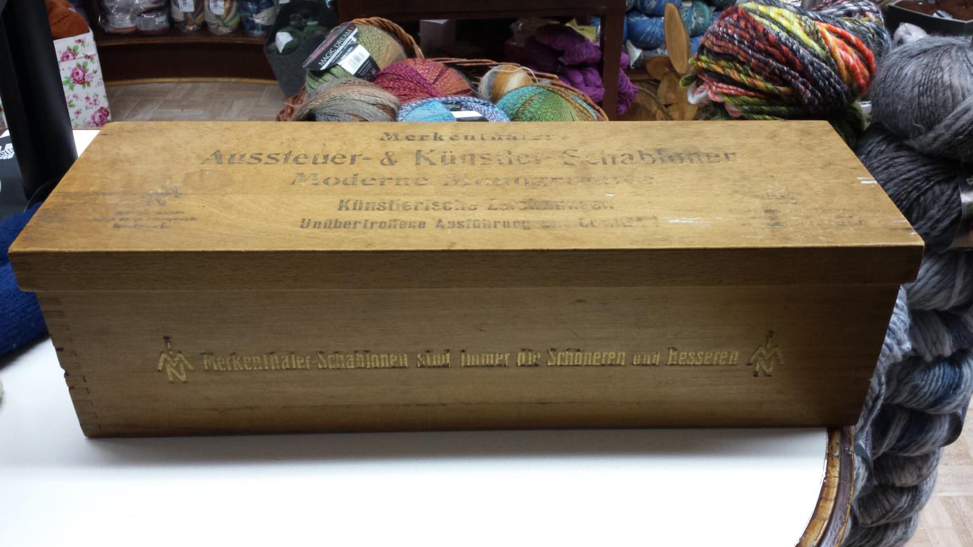 Abb. 4: Kiste mit Stickschablonen der Firma Johann Merkenthaler für Monogrammstickerei. Diese Kiste wurde im Handarbeitshaus in Meschede aufbewahrt. Die Schablonen wurden noch in den 1950er Jahren für die Ausbildung zur Kunststickerin benutzt (eigenes Foto).