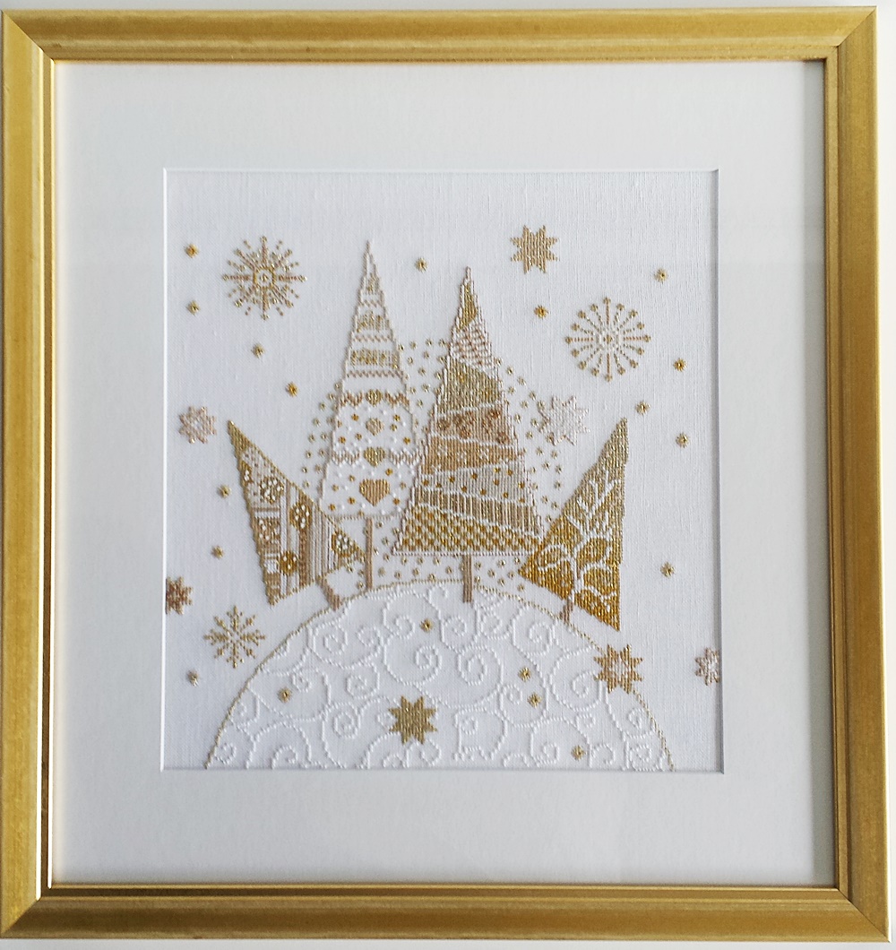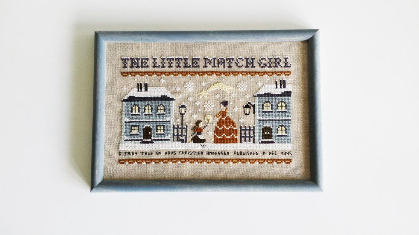 Abb. 17: Beispiel für eine Kreuzstichstickerei, die auf eine Geschichte anspielt, hier das Märchen „Das Mädchen mit den Schwefelhölzern“ von Hans-Christian Andersen, 2020 (eigene Stickerei, eigenes Foto)