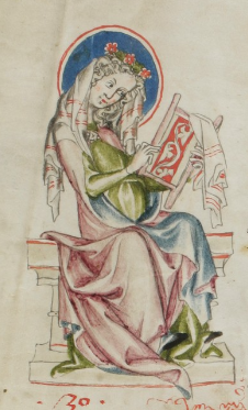 Apparently, embroiderers also used templates created by artists. These drawings were probably originally intended for painters, glass painters, and miniature painters[59], but could certainly also be used as templates for embroidery. One of the surviving model books is the Pepysian model book, which was created in the second half of the 14th century.[60] Notes, names, and comments written in the book indicate that the surviving copy was used by various people and passed on from one to another.[61]