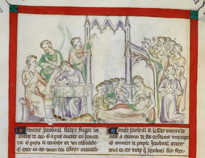 Fig. 4: Bezalel and Oholiab working on embroidery for the temple. Scene from the Book of Exodus from a picture Bible created in the style of Giotto, Padua, around 1400.- In: Staniland, Kai: Embroideres, London 1991, S. 27